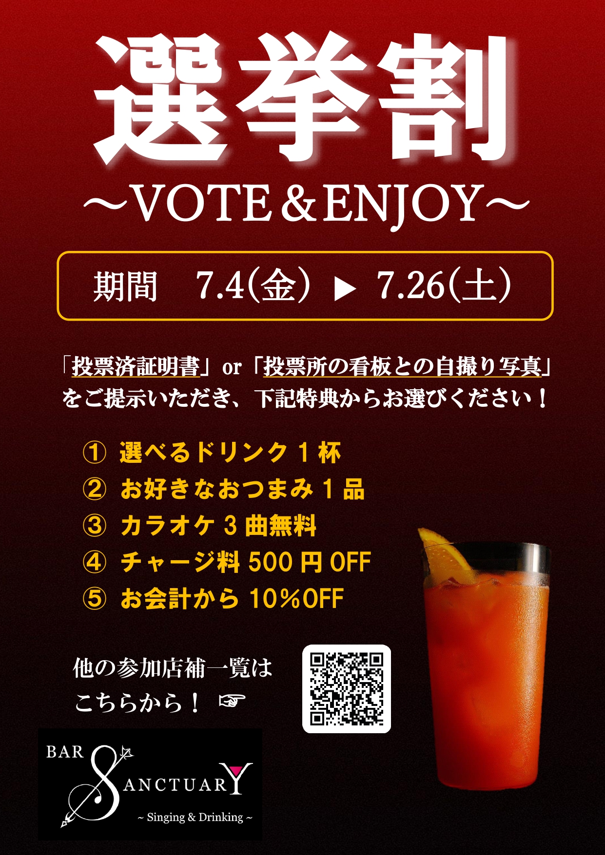 🗳 選挙割キャンペーン開催中 本日より、衆議院議員選挙の期日前投票が始まりました。 BAR SANCTUARYでは、選挙に参加された皆さまへの感謝と敬意を込めて、今回も「選挙割」キャンペーンを実施いた