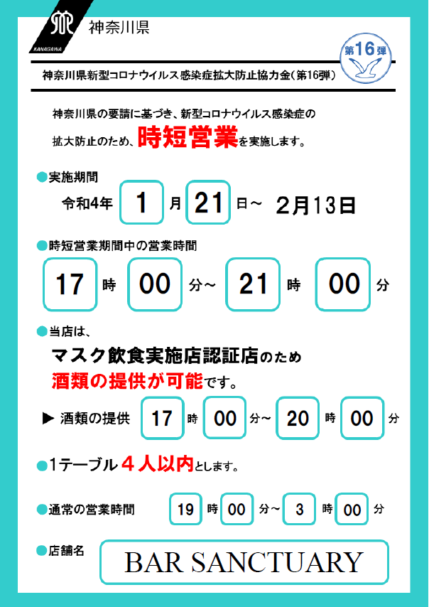 2022年もこのお知らせをしなければならないのは誠に残念ではございますが、神奈川県のまん延防止等重点措置の発出に伴い、営業時間を短縮する事といたしました。 1月21日(金)から2月13日