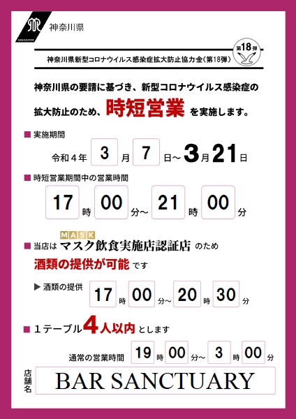 3月6日(日)をもって解除が予定されていた神奈川県のまん延防止等重点措置ですが、この度さらに2週間の延長が決まりました。 それに伴い、下記の通り営業時間の短縮期間を再延長いたします。 &