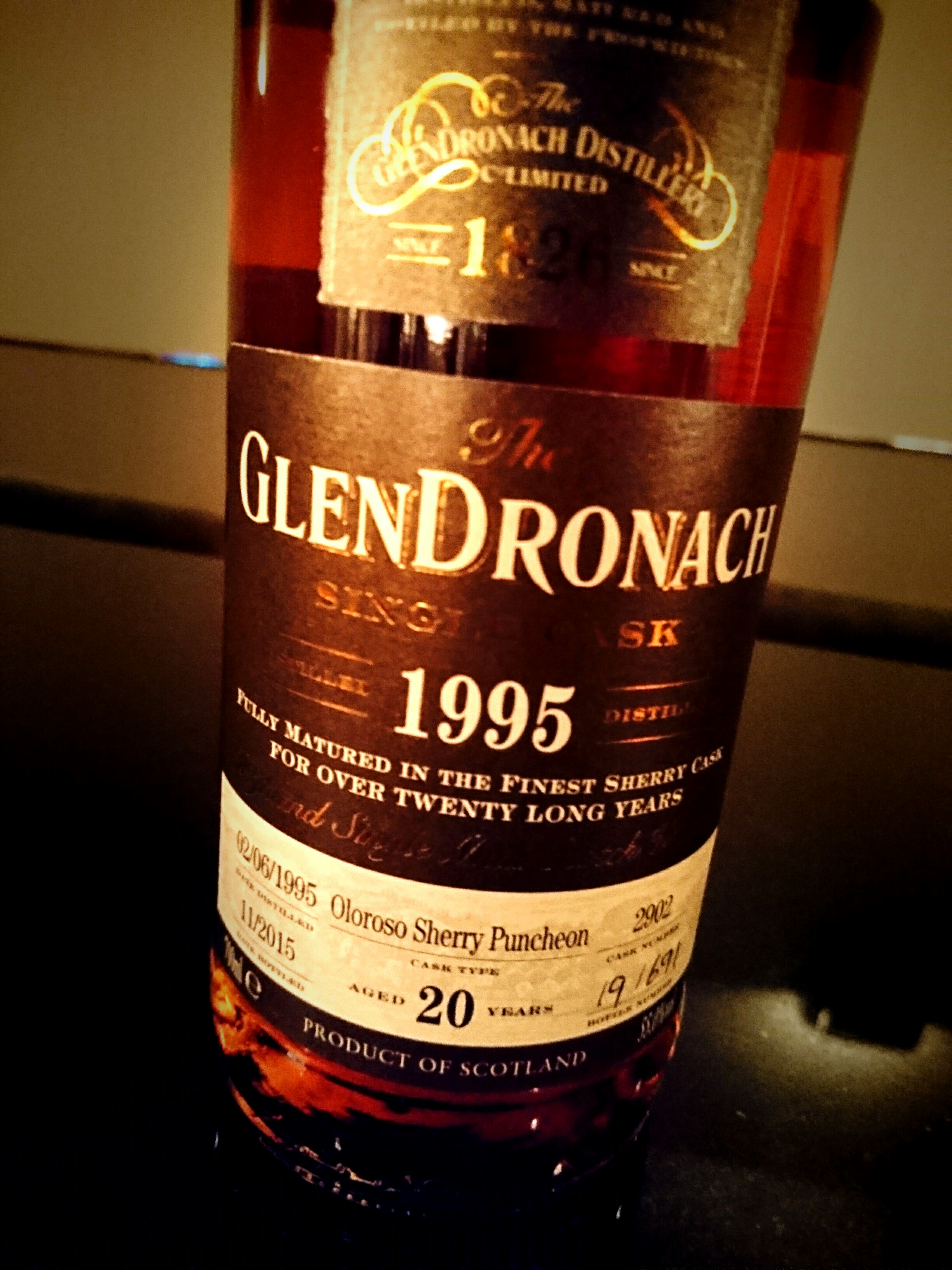前回のザ・マッカラン ダブルカスク12年からの流れで、シェリー樽ボトルをもう1種類。 「GLEN DRONACH 1995 20y Oloroso Sherry Puncheon」。 1995年蒸留、